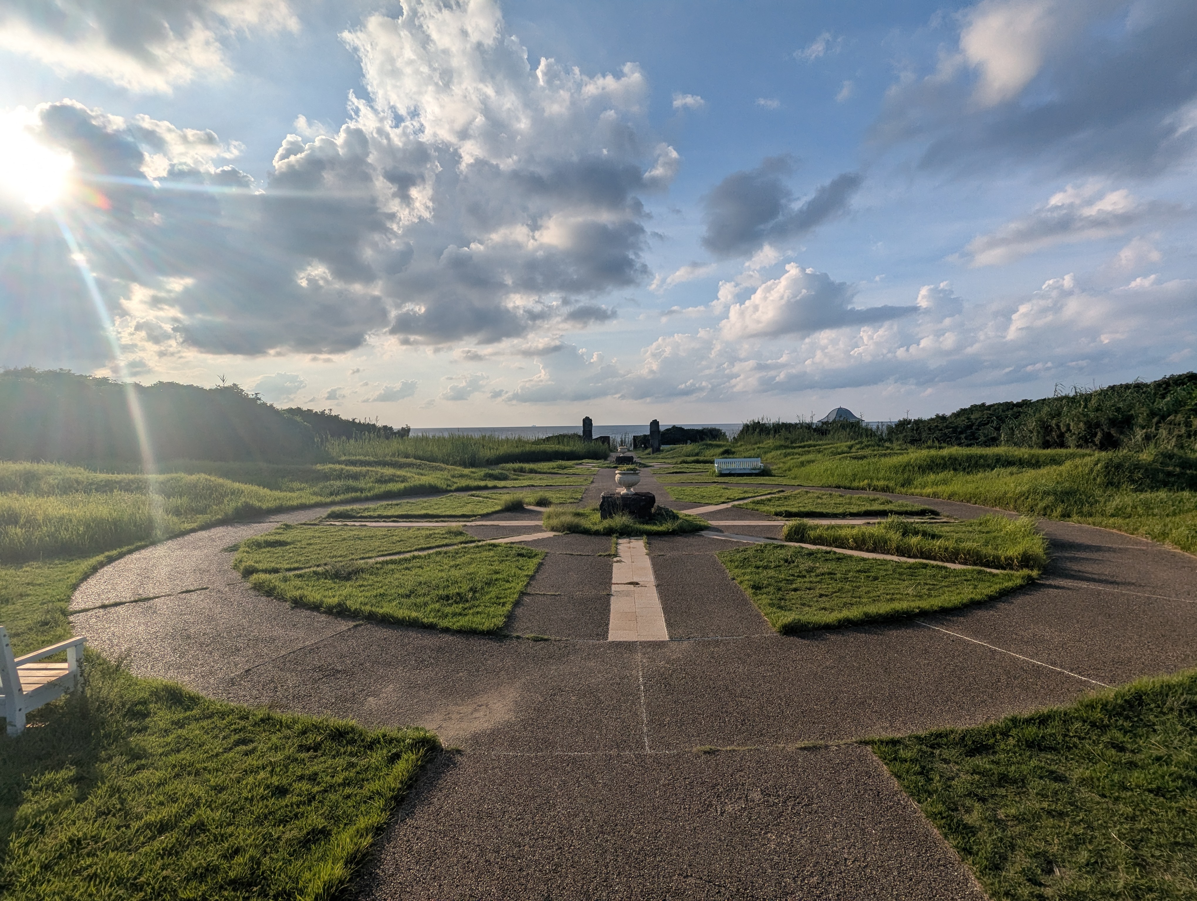 中央に置かれたオブジェとその先の謎の門、さらに先には海。