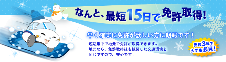 ハイスピードコースをお選びいただくと、普通車なら最短15日で免許が取れます。集中的に教習を受けて、短い期間で効率的に免許取得が可能です!