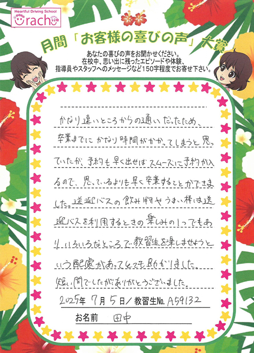 「遠方からの通学で卒業が長引くと思ったが、予約がスムーズで予想より早く卒業。送迎バスでのお菓子配布など楽しませる配慮がありがたかった」
