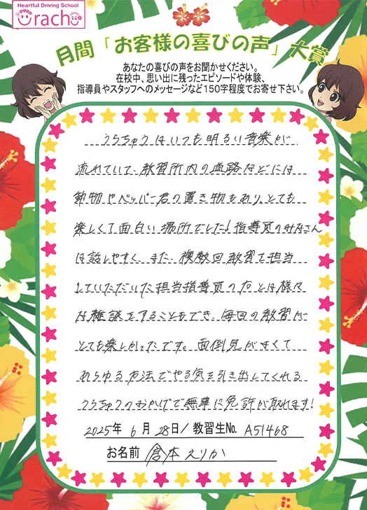「うらチュ~は明るく楽しい雰囲気で、指導員の方とは雑談もでき毎回の教習が楽しかった。面倒見が良くやる気を引き出してくれる教習所でした」