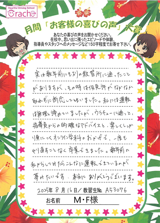 「別の教習所で仮免許が取れず諦めていましたが、うらちゅ~では指導員の的確なアドバイスとオンライン学科のおかげでスムーズに卒業できました」