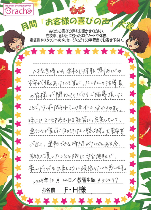 「入校当初は運転が怖く不安でしたが、指導員の分かりやすくユーモアある教習で和らぎました。これからは、教えを胸に安全運転で頑張ります」
