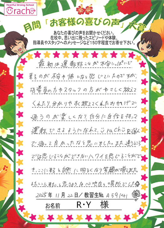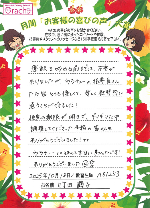 「最初は運転が不安でしたが、丁寧な指導で自信がつき、うらチュ~を選んで良かったと思いました。ここに来ると笑顔が増え心地よい場所でした」