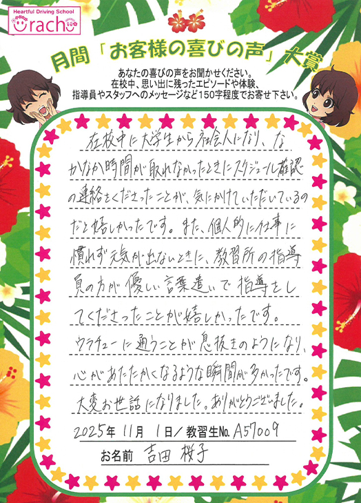 「入校当初は運転が怖く不安でしたが、指導員の分かりやすくユーモアある教習で和らぎました。これからは、教えを胸に安全運転で頑張ります」
