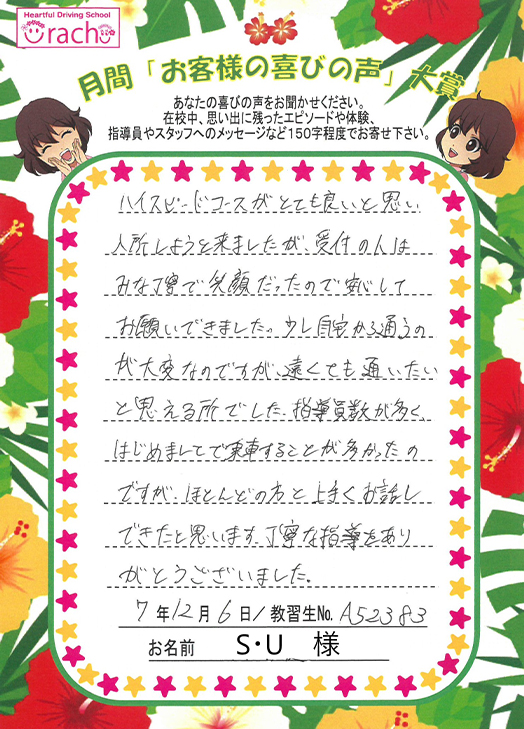「ハイスピードコースに魅力を感じて来所。笑顔で対応してくれた受付に安心して入所をお願いできました。教習中は丁寧な指導をありがとう!」