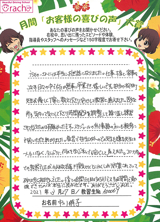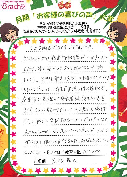 ★大賞「コロナ感染対策予防がしっかりとされた環境で安心。まだ沢山教わりたい!と思える教習所です」
