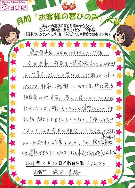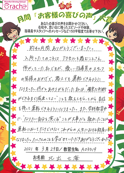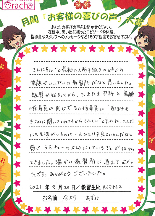 「入所手続きからこんにちは!と笑顔でいっぱいの教習所でした。一人ひとりを見ている温かい教習所に通えてよかった」