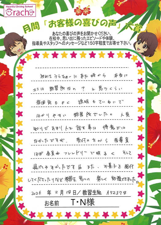 「笑顔のスタッフが多く、楽しく教習できました。指導時は説明が具体的で、覚えやすく力がつきました。楽しく免許を取るならうらチュ~です」